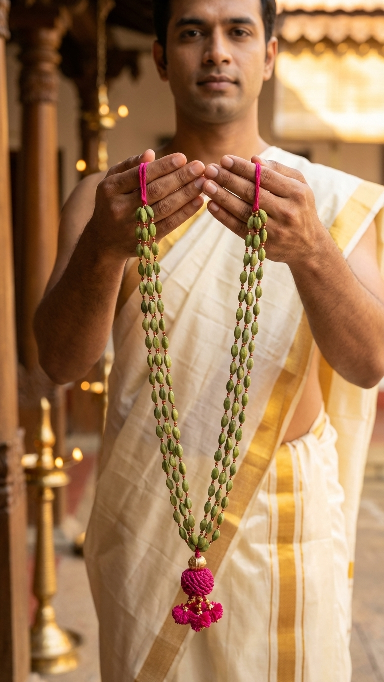 The Elachi Garland is a traditional handcrafted garland made using carefully selected premium green cardamom pods. This unique garland represents prosperity, purity, and devotion, making it ideal for temple rituals, wedding ceremonies, and religious celebrations.